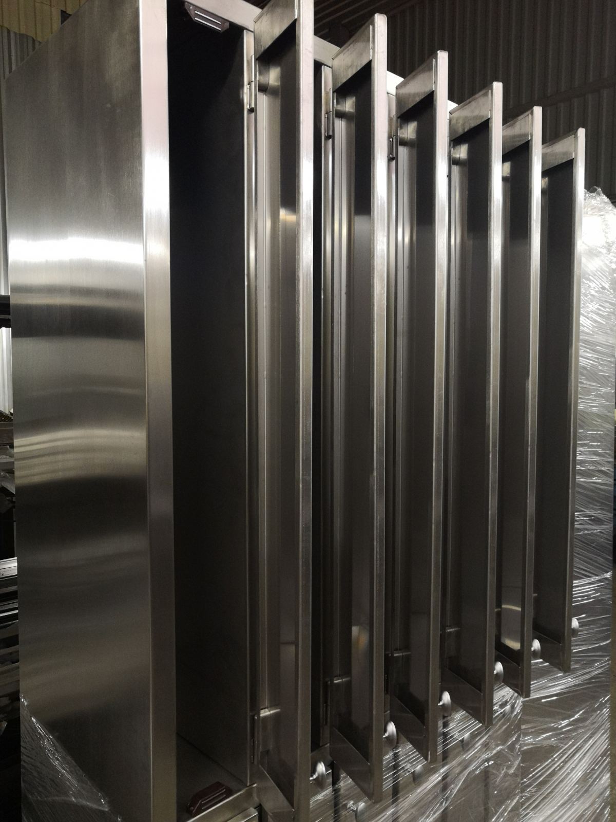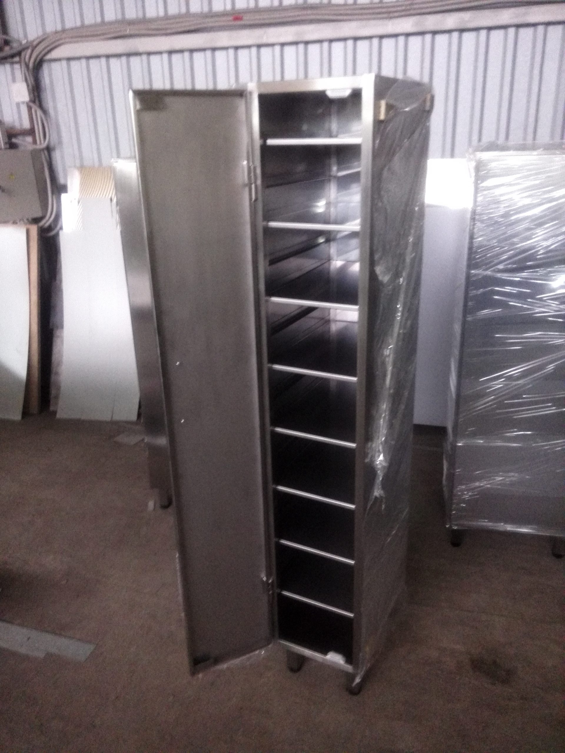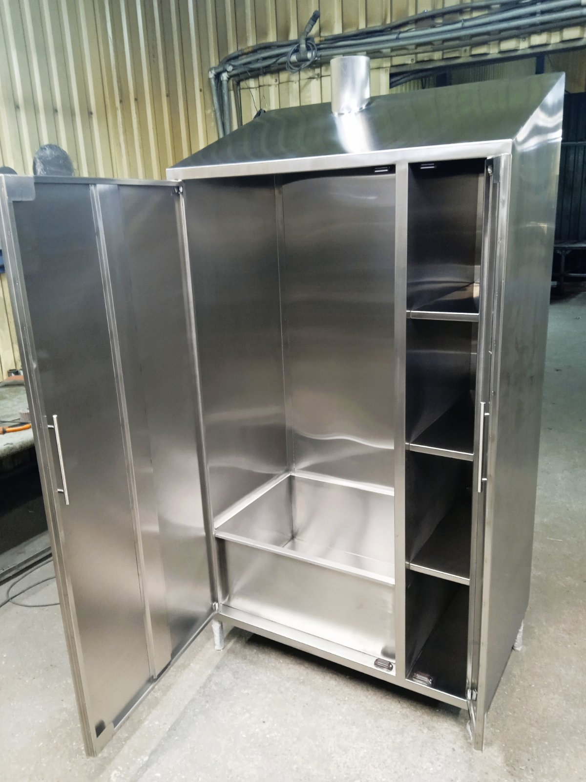 Изготавливаем любые шкафы под заказ, как с распашными дверями, так и с раздвижными. Укомплектовываем необходимым количеством полок. Корпус шкафов и усиленный каркас выполняется из качественной нержавеющей стали (Aisi 304 и 430).