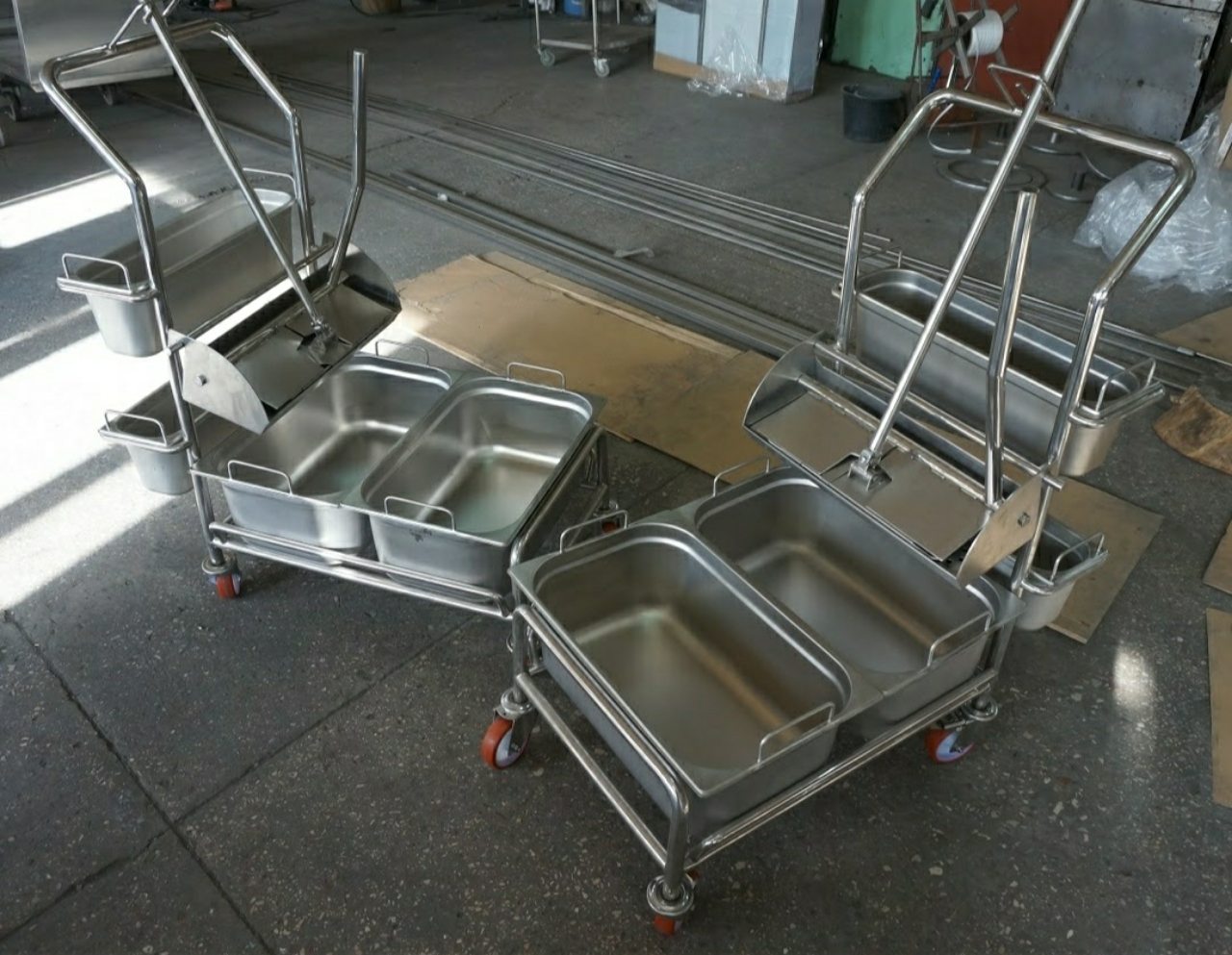 Также мы изготавливаем тележки для использования на предприятиях общественного питания, хлебозаводах, мясокомбинатах, птицефабриках, в частности, тележки (рамы, стеллажи) для заморозки продуктов, полуфабрикатов (пельменей), рамы передвижные (тележки) для посолки и созревания сыра.
