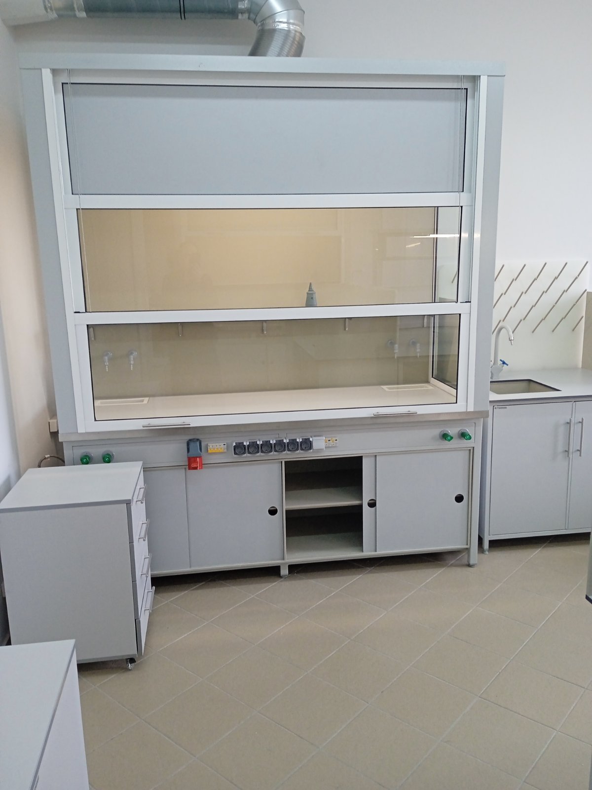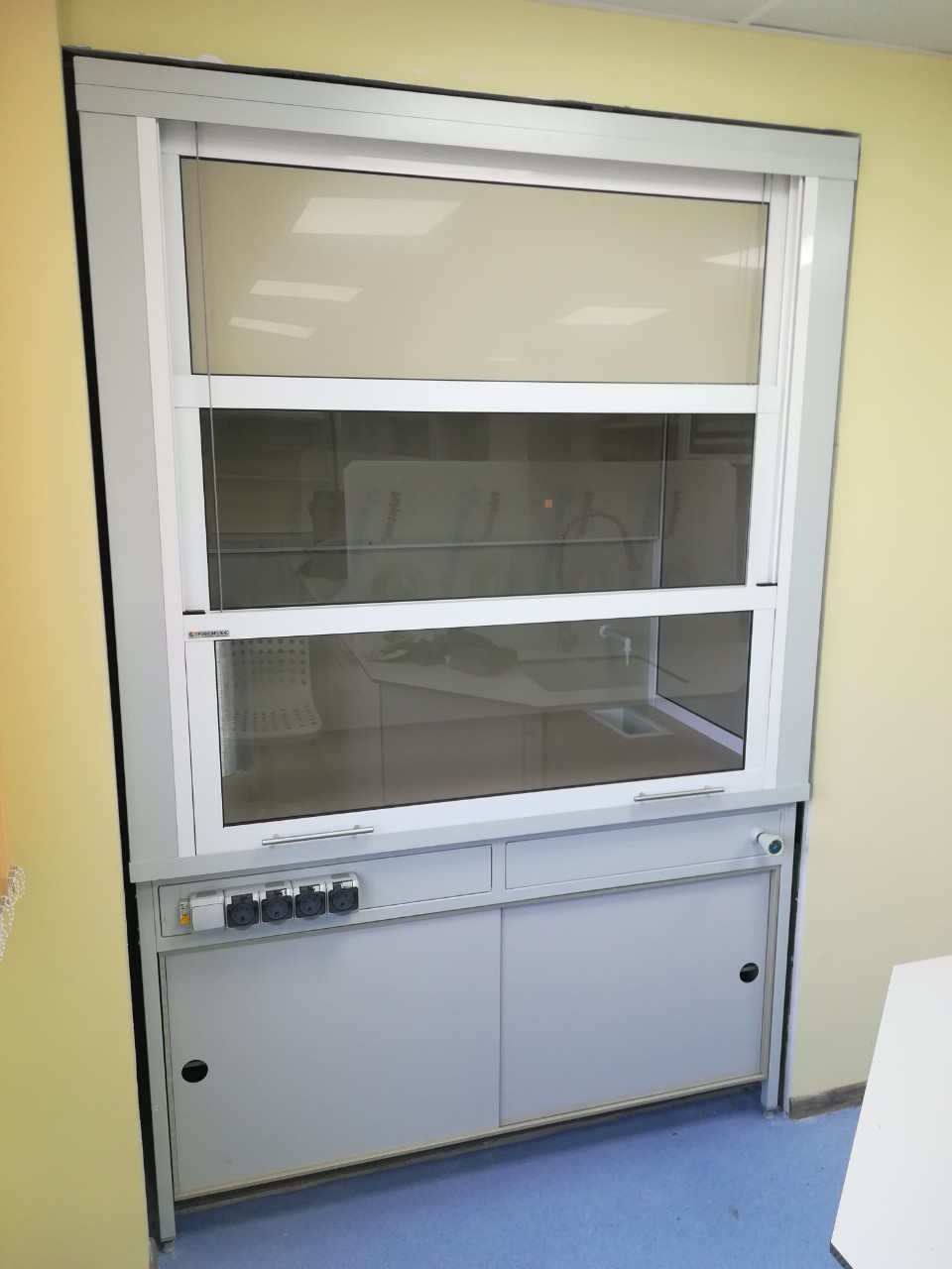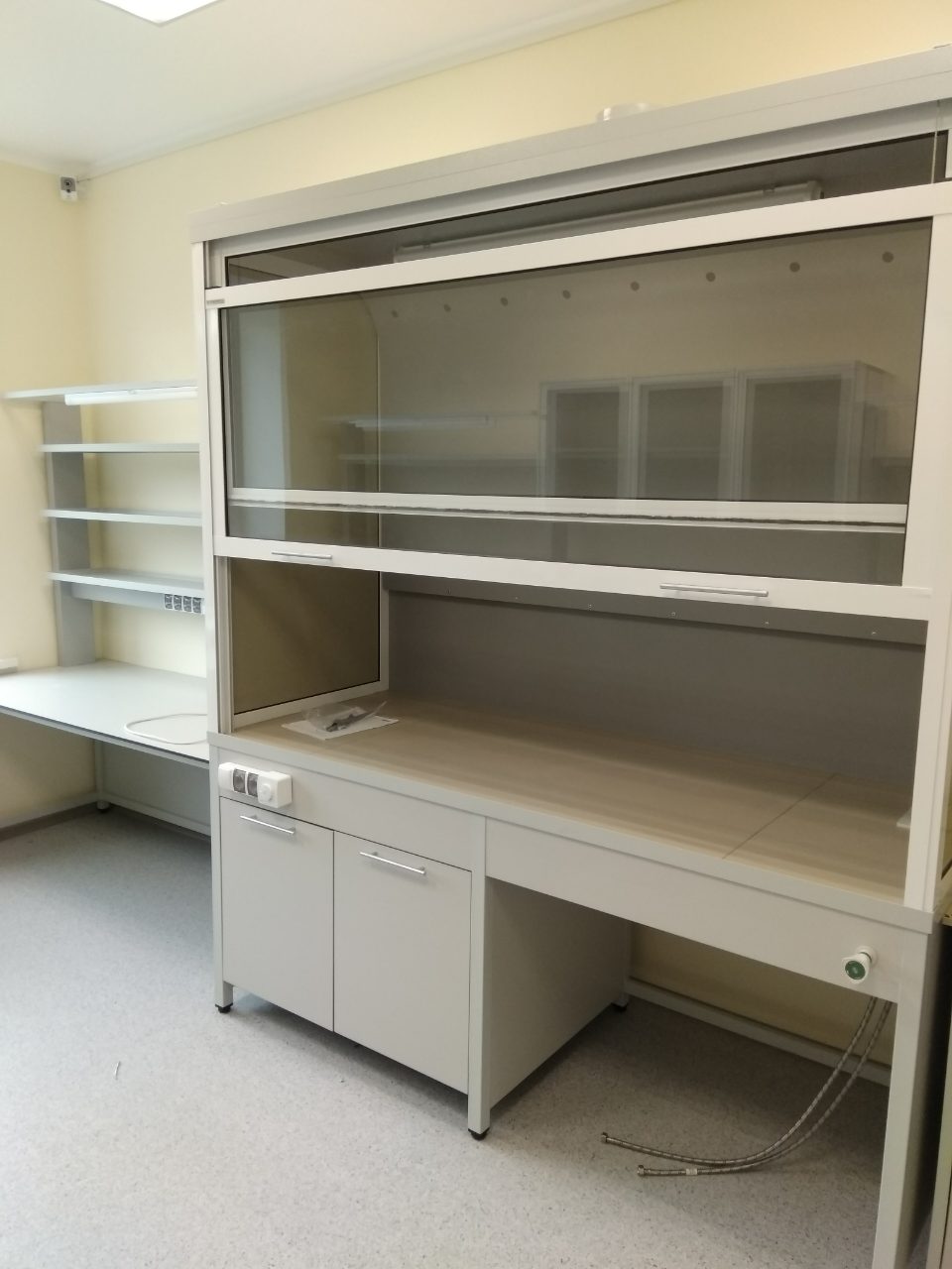 Вытяжные шкафы могут иметь различные конструктивные элементы, такие как регулируемые по высоте рабочие поверхности, встроенные освещение, сантехоборудование (специальные краны, мойки), блоки розеток и многое многое другое.